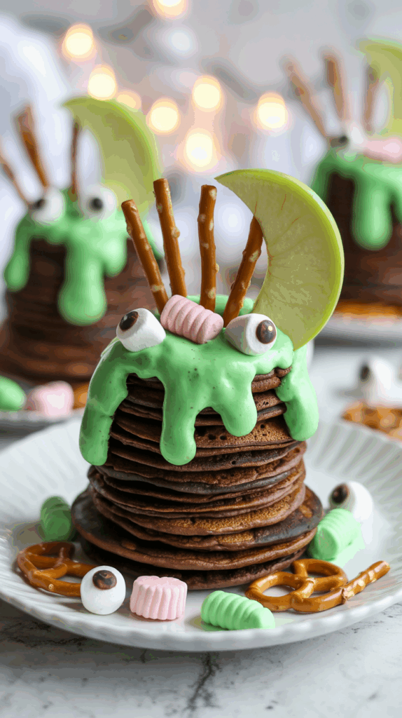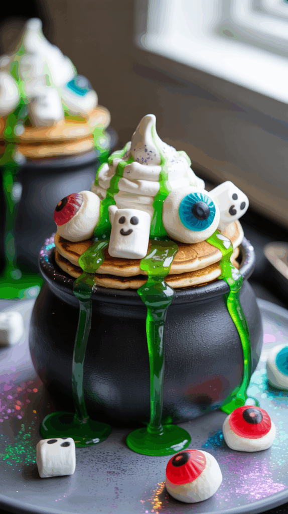 Make mini round pancakes and stack them to resemble bubbling cauldrons. Top with whipped cream “froth” and drizzle with green syrup (mix maple syrup with natural food coloring or matcha). Add gummy eyeballs, marshmallow “ghost puffs,” and sprinkle with edible glitter. For a dramatic touch, serve it in a black ramekin or small cast-iron skillet. Kids will feel like wizards mixing up breakfast spells—and the result is magical, both in flavor and presentation!