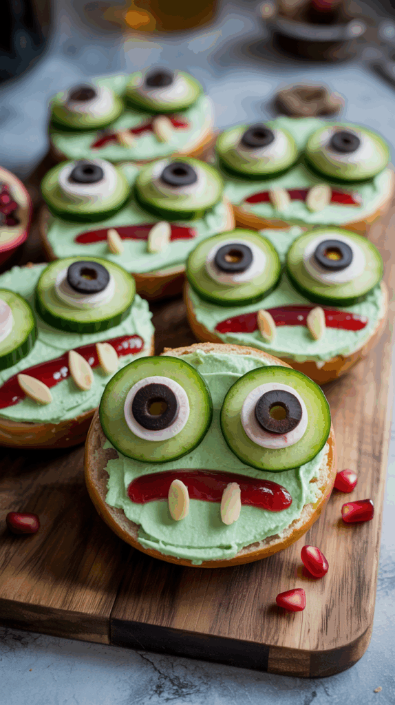 Top whole grain bagel halves with cream cheese dyed green or purple. Add sliced cucumbers or kiwis as big zombie eyes, with olives in the center as creepy pupils. Use strawberry jelly or pomegranate seeds to create “bloodshot” lines around the edges. Add a fruit leather mouth, maybe even fangs with slivered almonds. They’re goofy, gory, and totally irresistible to little monster fans.