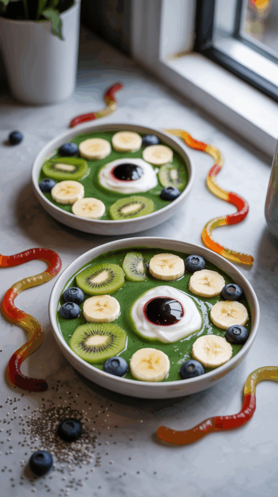Blend up a green smoothie base using banana, spinach, and pineapple for a sweet, healthy start. Pour into a bowl and add round slices of kiwi, banana, and blueberries arranged like monster eyes staring up! Use yogurt or whipped cream for “eye whites,” and edible black gel for pupils. Add chia seeds or black sprinkles for a monster skin effect. Surround the bowl with gummy worms “escaping” the creature. This breakfast is nutritious and creepy-cute all in one. Kids can help decorate their own monster face. It’s perfect for picky eaters who love a touch of play. And you’ve just made spinach cool—miraculous.