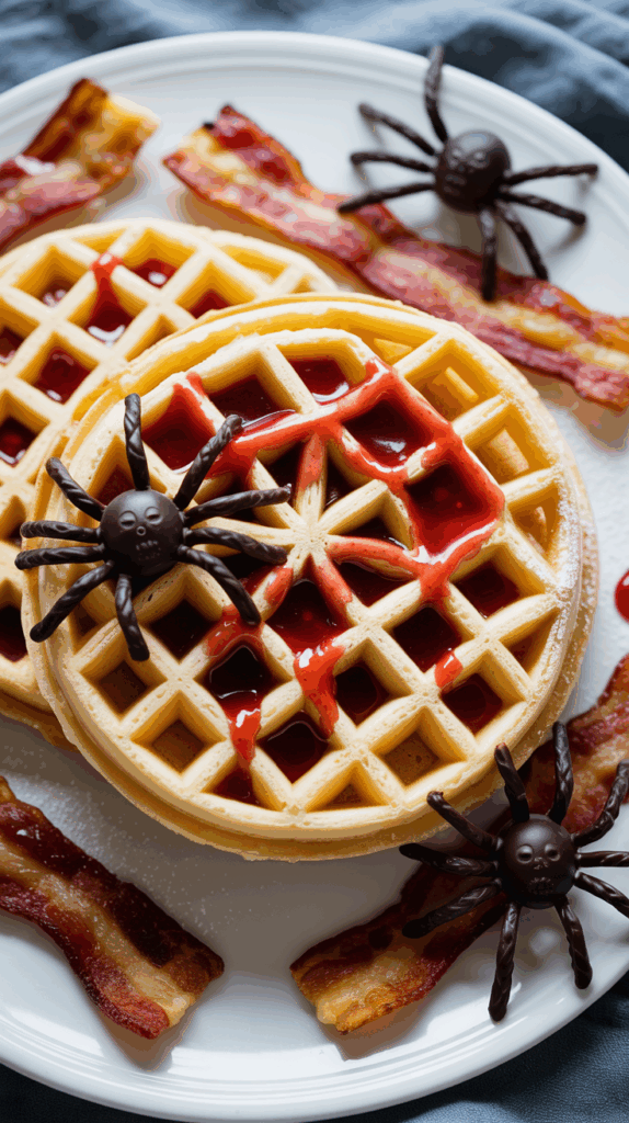 Create spooky spiderwebs by pouring waffle batter in a circular, spiraled pattern on a waffle iron. Once cooked, dust with powdered sugar “cobwebs” and drizzle with red strawberry syrup. Add plastic spiders (or make edible ones with licorice legs and chocolate chips) for a fun surprise. Plate with a side of bacon “twigs” for a forest effect. This one is crisp, sweet, and just scary enough to thrill little ones. The waffle web design is easy to make with a squeeze bottle. Kids will love pulling it apart like real web strands. You can even add pumpkin spice to the batter for a fall twist. It’s messy, spooky, and breakfast gold.