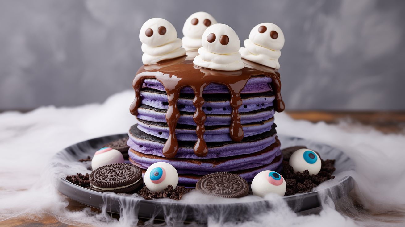 Start with purple and black-tinted pancakes stacked high like a haunted tower. Drizzle with chocolate syrup “slime” and top with whipped cream ghosts using mini marshmallows and chocolate chip eyes. Add candy eyeballs peeking out between the layers to make it even creepier. Place crushed Oreos at the base for a “graveyard dirt” look. Serve on a Halloween plate with dry ice fog for extra flair. This breakfast turns an ordinary morning into a full-blown spooky event. The soft pancakes and sweet toppings are kid-approved and parent-easy. You can even sneak in protein powder or mashed banana in the batter. Best part? The giggles when kids meet their marshmallow ghost friends.