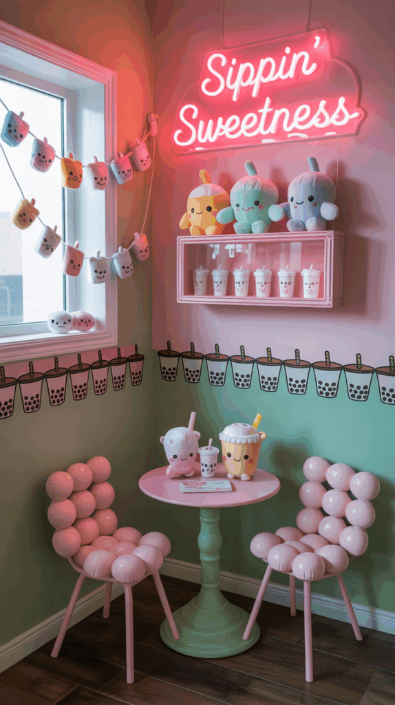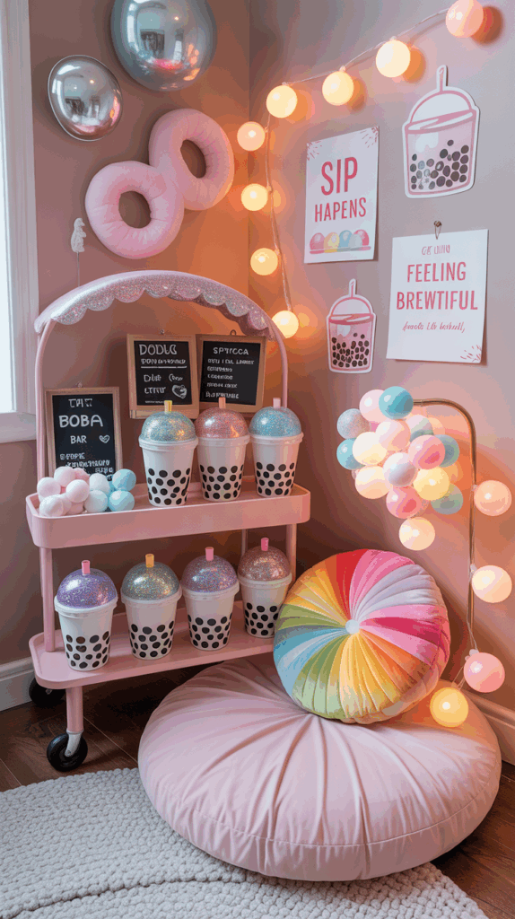 Design a corner dedicated to your favorite bubble tea obsession with a pastel cart-style shelf labeled “Boba Bar.” Display empty boba cups with glitter lids, plush tapioca balls, and mini chalkboards with fake drink menus. Hang a felt garland with different boba cup characters, each with kawaii faces and blushing cheeks. Use a round floor cushion shaped like a tea lid and add a rainbow straw pillow. Install a “Suck It Up, Cutie” neon sign for a fun twist. Set up a DIY boba lamp using string lights and ping pong balls as pearls. Create drink-themed wall prints that say things like “Sip Happens” or “Feeling Brewtiful.” Decorate with bubble-shaped mirrors or pastel vinyl decals. This space feels like stepping into a sugary, sippable daydream.