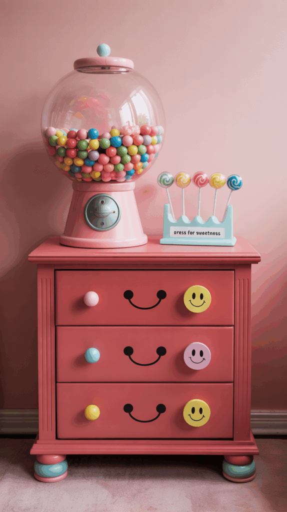 Transform an old dresser into a kawaii gumball machine by painting it cherry red and adding a faux dispenser window with colorful foam balls glued inside a plexiglass sheet. Replace drawer knobs with pastel-colored acrylic balls or painted wooden beads. Add smiley face decals to each drawer for extra charm. Use a silver-painted paper plate at the top as the “coin slot.” Add pastel-colored feet to the dresser to give it a candy dispenser silhouette. Tape a “Press for Sweetness” label on the side for fun. Line the drawers inside with candy-print contact paper. Add a lollipop holder rack on the side for hanging accessories or headbands. Top it off with a small candy dish filled with erasers or hair clips. It’s playful, practical, and the ultimate sweet-themed furniture flip!