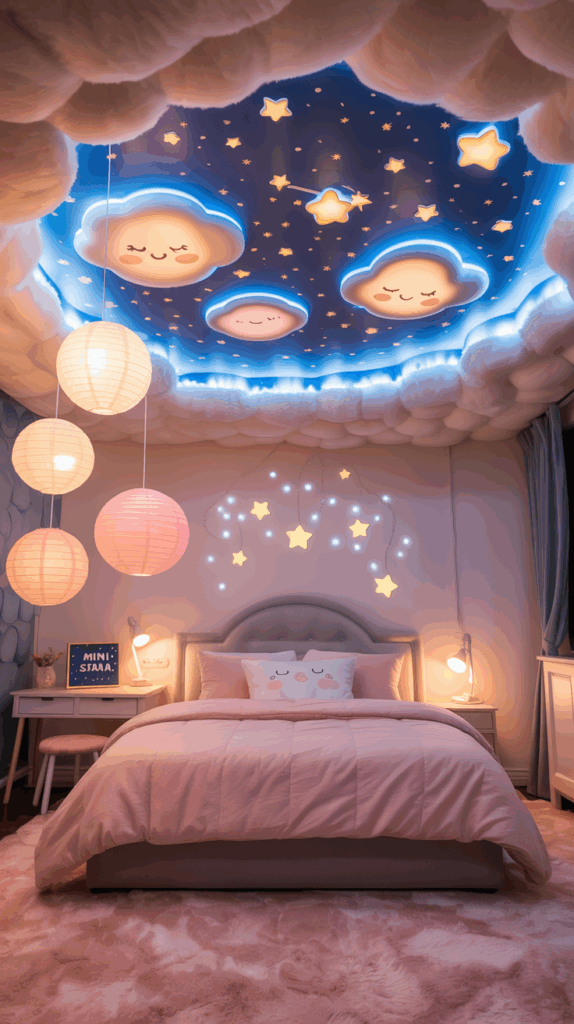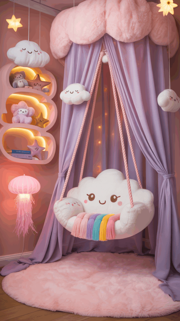 If you have the space (and a ceiling hook!), hang a small indoor swing shaped like a cloud with a plush seat and rainbow tassels. Drape a sheer pastel canopy around it for a floating-in-the-sky effect. Decorate the wall behind with sleepy cloud decals and a sign that reads “Sweet Dreams in Progress.” Add dreamy pillows shaped like stars, moons, or raindrops for comfort. Surround the area with floating shelf “cloud puffs” displaying plushies, resin stars, and dreamy books. Hang paper stars and mini mobiles from the ceiling. Add a pink jellyfish lamp or soft projector for relaxing ambient light. It’s a perfect zone for imagining, reading, or simply drifting into daydreams.