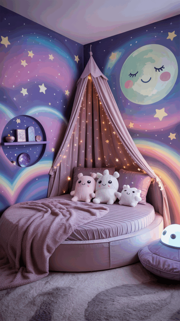 Create a sleepy stargazing spot with a galaxy-painted wall in lavender, pink, and mint with smiling stars and sleepy moons. Drape the bed in plush cloud pillows and space animal plushies like pastel aliens or cosmo bunnies. Use a moon-shaped shelf to display sparkly trinkets and constellation crystals. Hang a “Hello Galaxy” banner with glitter letters and light-up star string lights. Install a gentle projector that casts auroras in kawaii hues. Add a book nook with dreamy bedtime stories like “Stardust Snuggles.” A UFO beanbag chair makes the perfect reading spot. Hang a fabric tent with twinkly star decals for cozy naps. It’s the ultimate dreamy retreat for cosmic cuties.