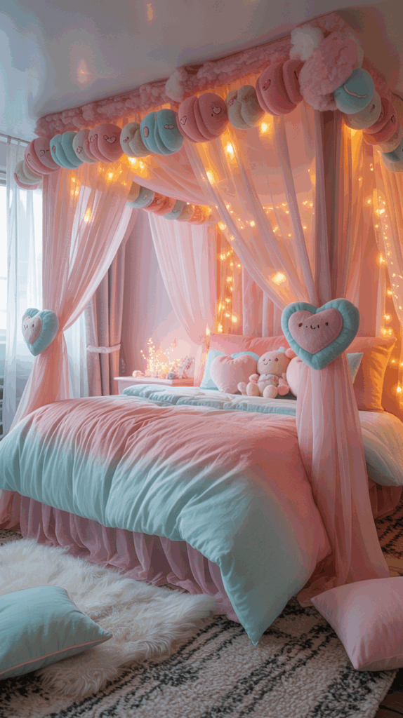 Wrap your bed in sheer pastel curtains with light tulle swirls to mimic fluffy cotton candy clouds. Add hanging pompoms or pastel paper lanterns from the ceiling like floating sweets. Your headboard can feature plush hearts, cloud-shaped cushions, or cotton candy stickers. Use a bedding set in ombré pink, baby blue, and mint with embroidered “sweet dreams” quotes. Top it off with a candy garland made of soft felt candies or marshmallow beads. Hide fairy lights inside the canopy for a soft magical glow. Bonus: include a small pocket on the side of your bed canopy for plushies to “sleep over.” It’s dreamy, playful, and oh-so-sweet.