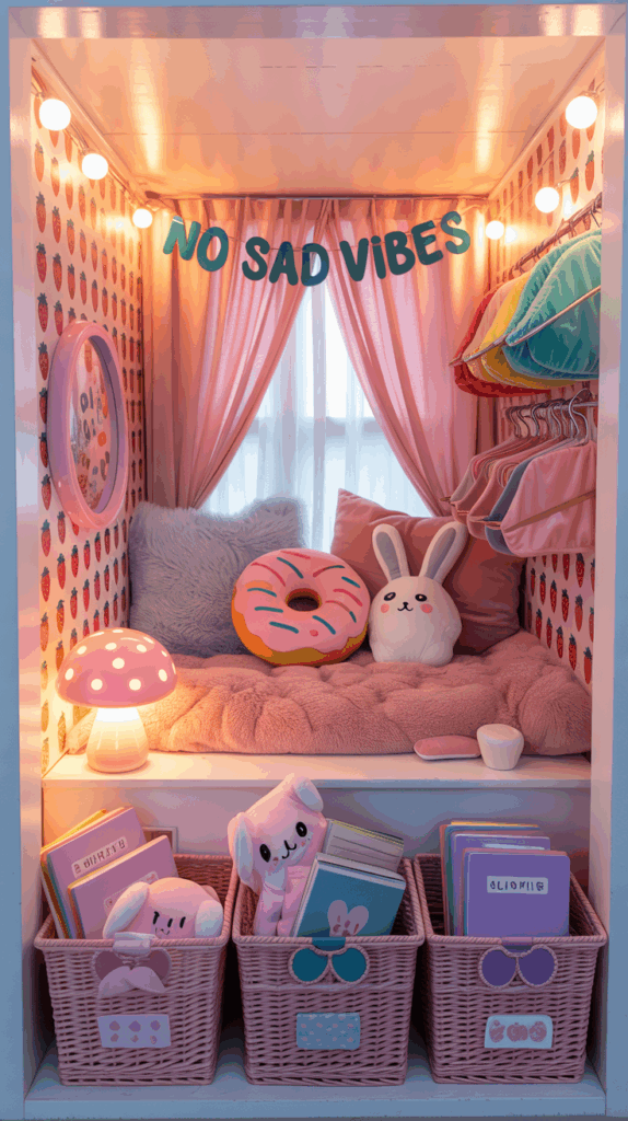 Transform an open closet into a kawaii hideout with fluffy pillows, pastel curtains, and heart-shaped shelves. Hang a sign that says “No Sad Vibes” or “Rainbow-Only Zone.” Use wallpaper or contact paper to line the walls in pastel checkerboard or strawberry print. Store journals, snacks, and plushies in labeled pink baskets. Add a mini mirror for outfit try-ons and a color-coded shoe rack with bows and charms. A small floor mattress with donut or bunny pillows turns this into a secret nap spot. Hang clip-on LED lights or use a soft light mushroom lamp. Add a “Daily Mood” spinner for fun. This is part fashion corner, part emotional recharge station.