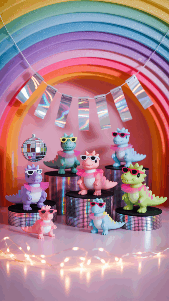 Add a pastel dino twist to your display shelf with kawaii dinosaur figurines in tutus and sunglasses, grooving on mini disco platforms. Use sparkly tape to section each dino’s “dance floor” and hang holographic paper chains above. Add a tiny disco ball from the dollar store and battery fairy lights to amp up the glow. Create nameplates like “DJ Roary” and “Boba the Brontosaurus” for your dino crew. Each shelf can be a mini scene, like a dance battle, karaoke night, or birthday party. Add layered backdrops in gradient foam sheets for a stage-like vibe. This mashup of retro glam and prehistoric charm is pure kawaii chaos—in the best way.