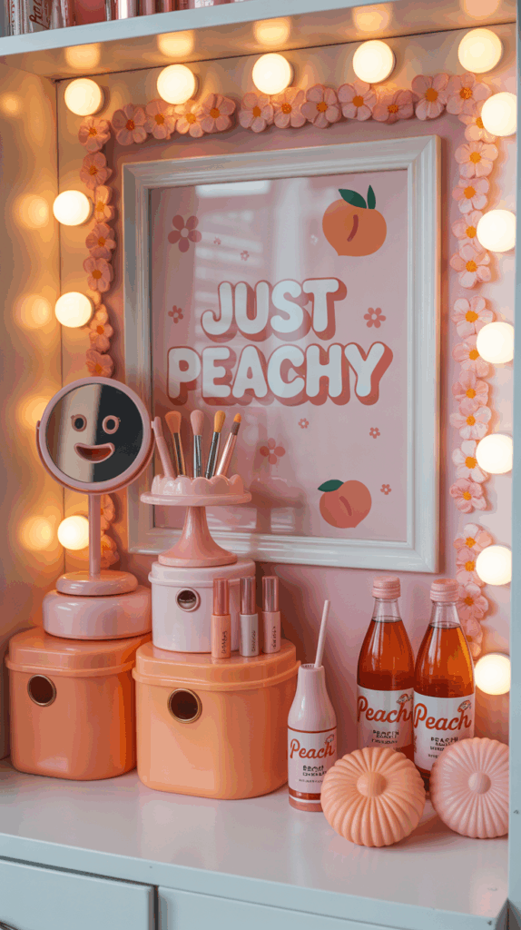 Dedicate a vanity shelf to a peach-themed color palette. Choose peach-colored storage bins, trays, and mirrors accented with tiny flower motifs. Use round peach containers for storing lip gloss and brushes, and stack them on pastel cake stands. Hang a mini mirror framed in soft faux fur shaped like a peach emoji. Stick peach blossom decals around the shelf border. Frame a pastel poster that says “Just Peachy” in bubble font. Display Japanese peach soda bottles as decor (emptied, cleaned, and sealed). Use peach-colored LED strip lights along the shelf edges. Add a squishy peach stress toy and a pastel mini brush cleaner. The vibe? A soft, fruity, and oh-so-sweet glam station.