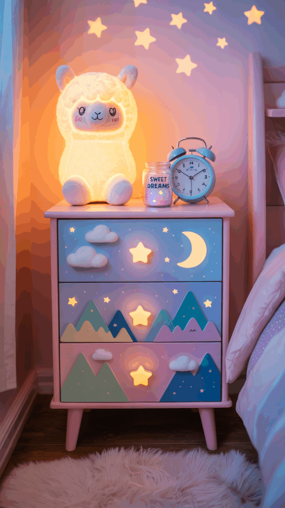 Transform your nightstand into an alpaca-themed dream station. Use vinyl stickers to create an alpaca landscape on the drawer fronts—add little clouds, pastel mountains, and moon shapes. Place a soft plush alpaca lamp or nightlight on top, alongside a kawaii alarm clock and a “sweet dreams” jar filled with glitter “sleep dust.” Line the drawer with star-patterned paper and hide bedtime essentials like lotion, a journal, or lip balm. Add an “Alpaca My Pajamas” sign or mini framed pun quote. Stick glow-in-the-dark stars to the drawer handles for a sleepy-night sparkle. This makes the transition to dreamland cozy and super cute.