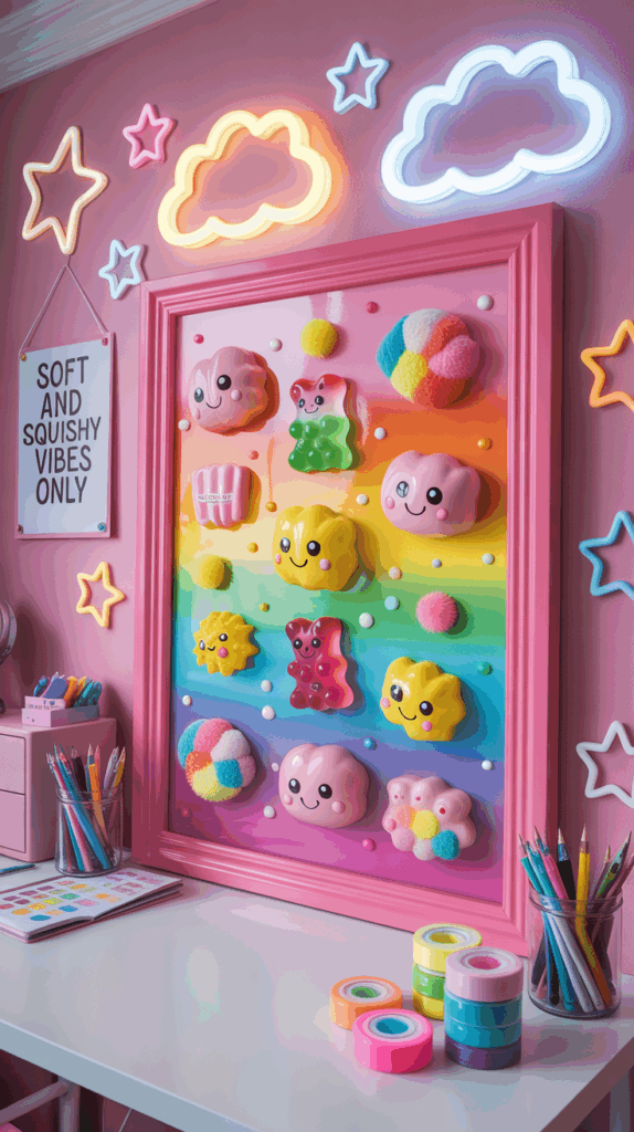 Paint a large canvas or foam board with soft ombré pastels and then add raised squishy shapes of jelly creatures like smiling blobs, boba jelly cubes, or gummy bears. Use dimensional puffy paint, pom-poms, and googly eyes to make them pop. Frame the piece in a bubblegum pink or lavender frame for a gallery look. Surround it with glow-in-the-dark stars and neon cloud-shaped wall lights. Add a sign that says “Soft and Squishy Vibes Only.” Below it, place a desk with color-coded jars of art supplies like glitter pens and pastel washi tape. Display mini jelly charms and squishies on a peg board. Create your own art and swap out pieces with Velcro for an interactive gallery wall. It’s the ultimate mix of kawaii and creative flair!