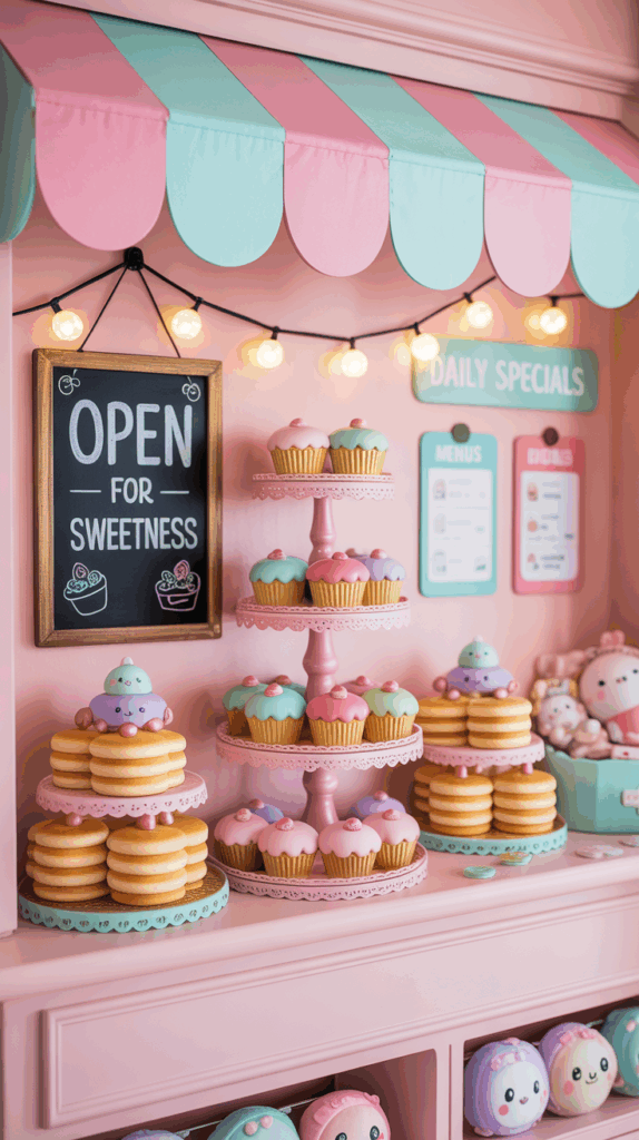 Transform a shelf wall into a faux bakery window with pastel cupcake stands, mini cake boxes, and decorative doilies. Use cardboard or foam board to create a scalloped “awning” over the display, painted in pink and mint stripes. Fill small jars with faux sprinkles, glitter “sugar,” and mini pastry plushies. Tape up a chalkboard sign that says “Open for Sweetness” with tiny chalk-drawn pastries around the edges. Add battery-operated cake lights or a donut-shaped lamp. Print out mini menus or recipe cards and pin them to a soft pinboard. Stack faux pancakes and macarons with kawaii faces on bookends. Add a shelf labeled “Daily Specials” to rotate featured crafts, plushies, or stickers. Create mini signs like “Try our Cotton Candy Cookies” just for fun. It’s like living inside the cutest bakery in town—with zero calories.
