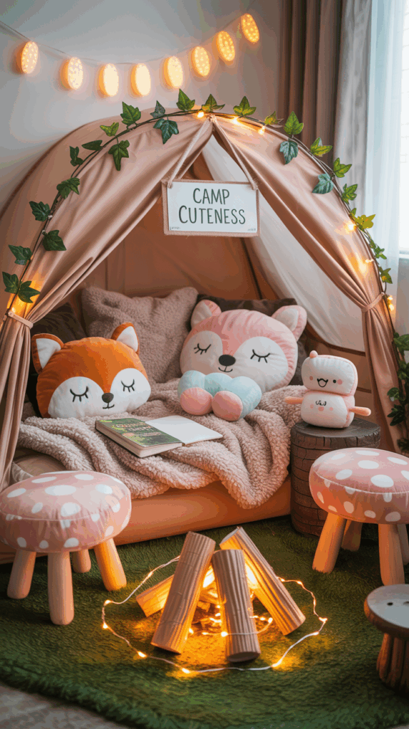 Use a pop-up indoor tent or canopy and turn it into a forest glamping nook with plush forest animal pillows (think sleepy foxes and pastel deer). Drape faux ivy and soft twinkle lights around the entrance. Add a fake campfire made from paper towel rolls, felt flames, and fairy lights underneath. Place a faux grass rug underneath with tiny mushroom stools or logs made from painted cardboard. Hang a sign that says “Camp Cuteness.” Inside, include soft fleece blankets, kawaii forest storybooks, and glow-in-the-dark firefly stickers on the ceiling. Include a DIY “marshmallow on a stick” plush toy. Craft a mini nature journal for collecting stickers or pressed faux leaves. Use pine-scented oil in a diffuser for the full forest feel. Cozy, magical, and totally photo-worthy!