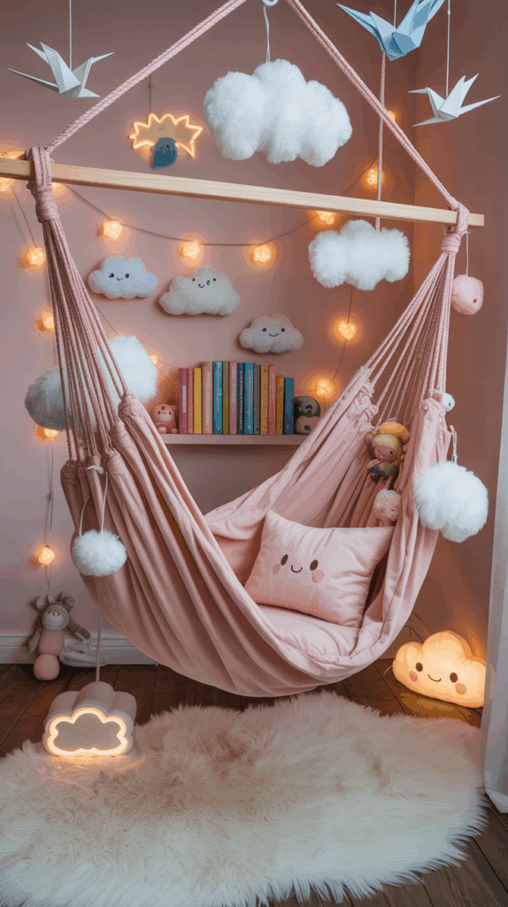 Suspend a pastel cotton hammock from the ceiling and surround it with hanging plush clouds and soft pom-poms. Use string lights shaped like stars and moons to cast a dreamy nighttime glow. Hang a small shelf nearby with rainbow-colored books and sprinkle cloud stickers across the wall behind the hammock. Add a “Floating in Cuteness” sign in whimsical lettering to complete the look. For extra charm, place tiny stuffed animals peeking out from the sides of the hammock like they’re reading too. Include a white faux fur rug underneath as a soft landing pad. Add a cloud-shaped speaker that plays lo-fi rain sounds. Hang origami birds from the ceiling using clear fishing line. Throw in plush lightning bolt pillows for a touch of contrast. This is a space for relaxing, dreaming, and cloud-hopping without leaving your room.