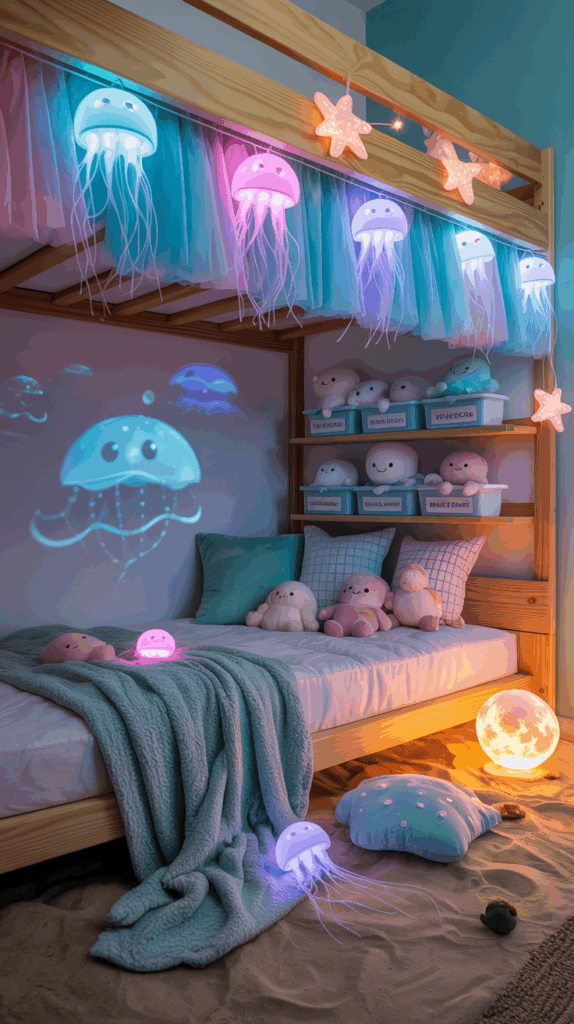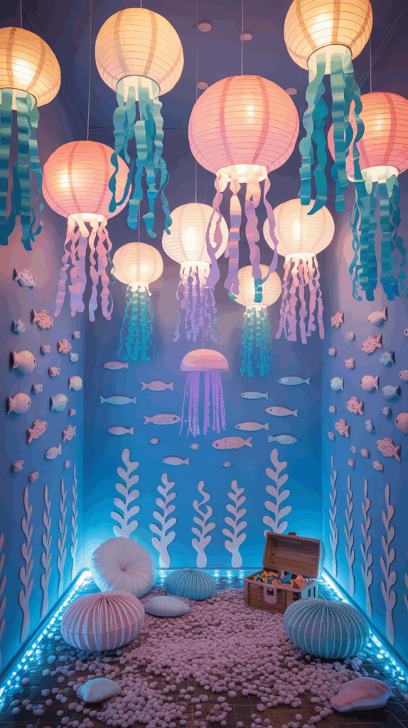 Take your ceiling from ordinary to underwater enchantment by hanging paper lanterns transformed into jellyfish with streamers in shimmering pastel tones. Use soft teal, lilac, and blush tones for the body and iridescent ribbon for the tentacles. Set them at different heights to mimic a floating effect. Tape soft blue lighting strips around the perimeter of the ceiling for a lagoon-like glow. Add paper cutouts of tiny swimming fish and pastel coral shapes peeking from the walls. Include a sign on the wall that says “Jelly Zone Only.” Use ocean-inspired diffuser scents like sea salt and citrus. Scatter pearl-shaped floor cushions below the jellyfish. Add a mini treasure chest toy bin to complete the undersea vibe. The whole setup feels like stepping into a mermaid’s dreamscape.