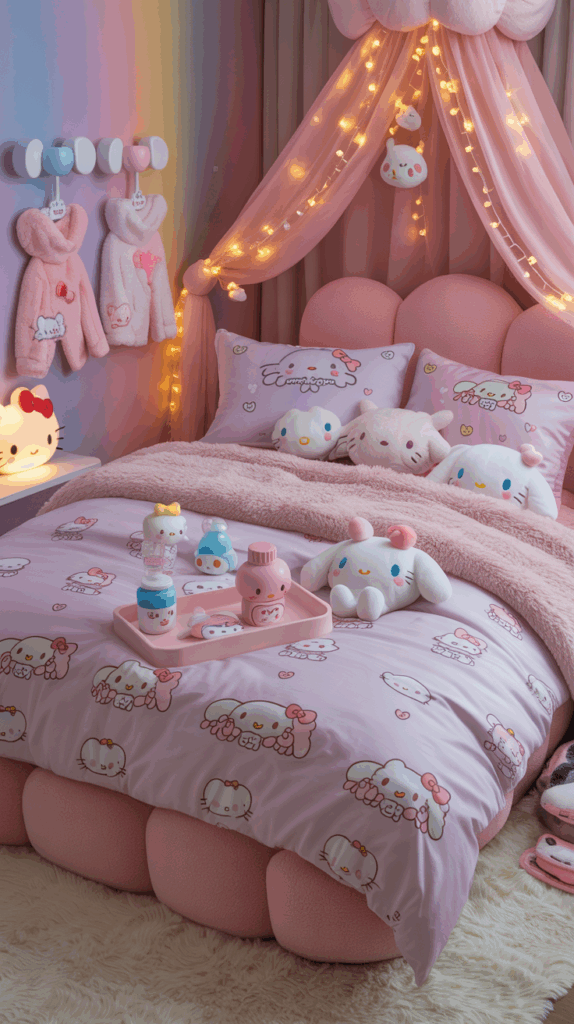 Go full-on Sanrio with a dreamy bedtime setup featuring Cinnamoroll, My Melody, or Kuromi. Pick pastel bedding with character patterns and layer it with plush character pillows. Frame fan art or posters with character-themed picture frames. Use a soft pink canopy over the bed dotted with fairy lights and miniature plushies hanging from clothespins. Install a Sanrio nightlight that glows in gentle pastel hues. Use character-shaped bins for pajamas or blankets. Hang wall hooks shaped like Hello Kitty bows for robes and accessories. Make your bedframe sparkle with string lights woven through. Keep a themed bedtime tray with lip balm, lotion, and a water bottle all in-character. It’s cozy, collectible, and filled with kawaii personality.