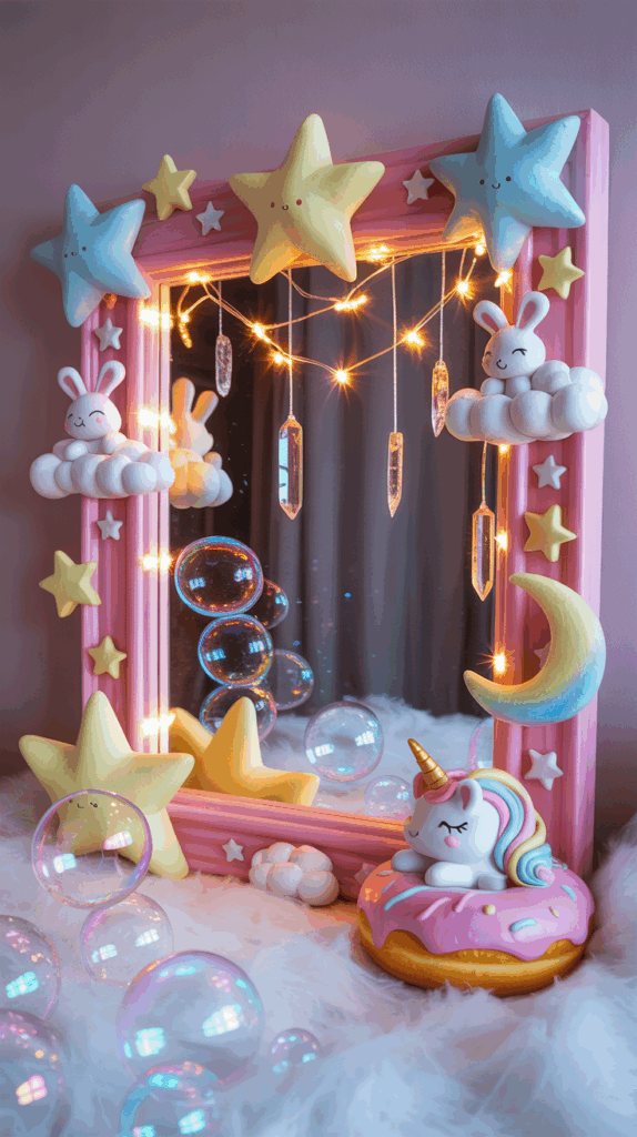 Give any mirror a magical makeover with a DIY enchanted portal frame. Surround the edge with sculpted clay stars, clouds, and pastel creatures (like bunnies riding moons or unicorns napping on donuts). Paint the frame in shifting pastel colors that sparkle in the light. Add battery-operated fairy lights behind the frame to glow like an activated portal. Etch or decal the words “You Look Magical” or “Portal Activated: Smile Detected.” Hang floating crystals (real or plastic) from the top corners on invisible thread. Use this space to get ready or take selfies that look like you’ve stepped into another world. Add a bubble machine nearby for the ultimate entry effect. Magical, fun, and totally one-of-a-kind!