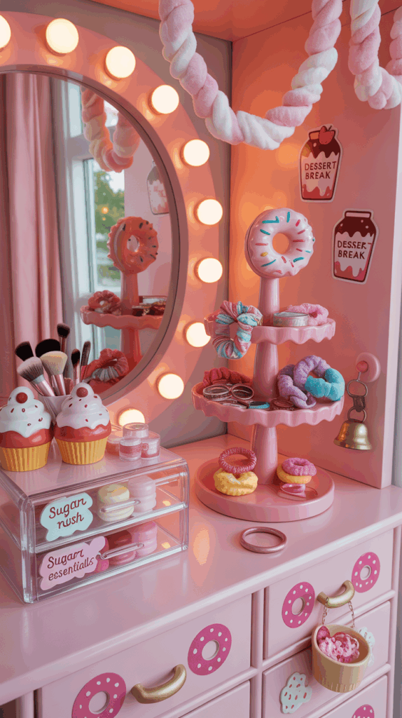 Turn your vanity into a sprinkle-filled fantasy using donut-shaped mirrors, cupcake brush holders, and ice cream sundae storage drawers. Stick strawberry milk carton decals on your mirror corners and hang whipped cream garlands overhead. Use a tiered pastel cake stand to hold scrunchies, lip glosses, and rings. Place a DIY resin “cookie tray” to organize earrings and accessories. Add scented candles that smell like cotton candy or peach gummies. Incorporate a clear drawer labeled “Sugar Rush Essentials.” Set up soft lighting with marshmallow lamp covers. For a final touch, a mini bell that says “Dessert Break” when you’re done getting ready.