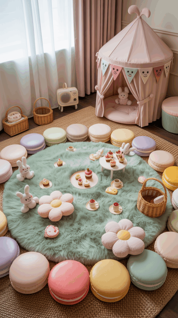 Craft a soft play area using macaron-shaped floor cushions in pastel tones stacked in a “meadow” pattern across the floor. Add flower-shaped pillows, plush bunnies, and mini picnic baskets. Hang wall art that says “Welcome to Macaron Meadow” with smiling desserts and singing flowers. Use pastel gingham blankets for the base layer and scatter pretend desserts or toy tea sets. Add a cupcake-shaped tent or hideaway dome for cozy reading. Above, hang bunting with dessert-themed characters or mini umbrellas with faces. Place a fuzzy rug in mint or lilac for extra cozy vibes. Set a mini speaker nearby to play soft instrumental café music. This area is equal parts dreamy, delicious, and delightful.