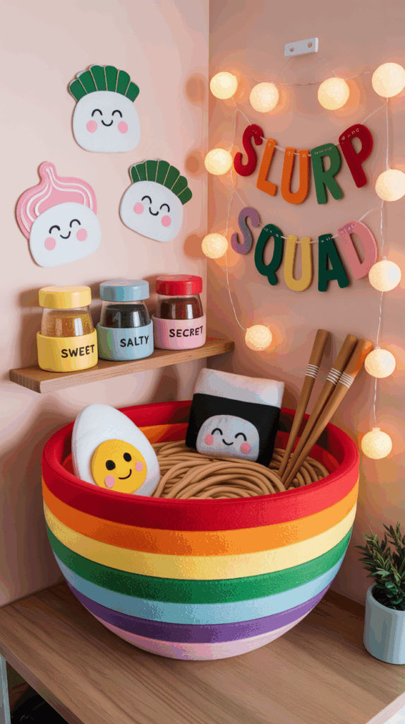 Build a corner desk or snack area inspired by a rainbow ramen shop. Use a faux noodle bowl as a catchall, complete with smiling felt egg, narutomaki, and chopstick plushies. Mount a pastel noodle bar sign with sparkly lettering that says “Kawaii Kitchen Open.” Add wall decals of floating ramen ingredients with blushing faces. Include mini shelves for tea, stickers, or snack stash containers labeled “Sweet,” “Salty,” and “Secret.” Hang fairy lights in noodle-string shapes and add a felt banner that says “Slurp Squad.” It’s quirky, colorful, and totally original—perfect for kids, teens, or anyone with a big imagination (and a love for carbs).