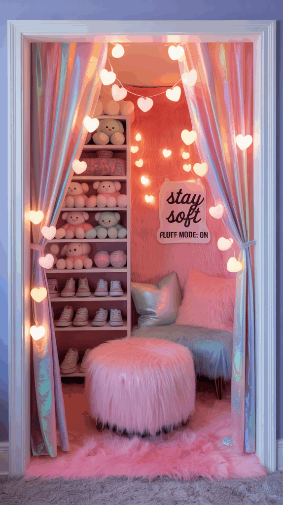Turn an open closet into a cozy kawaii retreat by lining the inside with faux cotton candy-colored fur (think pastel pink, baby blue, and lavender). Add a fluffy pouf or mini beanbag inside and hang battery-powered string lights shaped like hearts or candy. Use wall-mounted cube shelves in soft colors to store plushies or pastel sneakers. Drape pastel iridescent curtains across the closet opening for a secret hideout effect. Stick cute quotes like “Stay Soft” and “Fluff Mode: On” on the walls using pastel wall decals. Create a hanging mobile from origami hearts and tiny stuffed animals. Line the base with soft rugs and pastel pillows for lounging. Add a small Bluetooth speaker disguised as a marshmallow. Let kids or teens use it as a reading nook, a gaming cave, or a dreamy TikTok filming space. This closet is no longer for coats—it’s for cuteness overload.