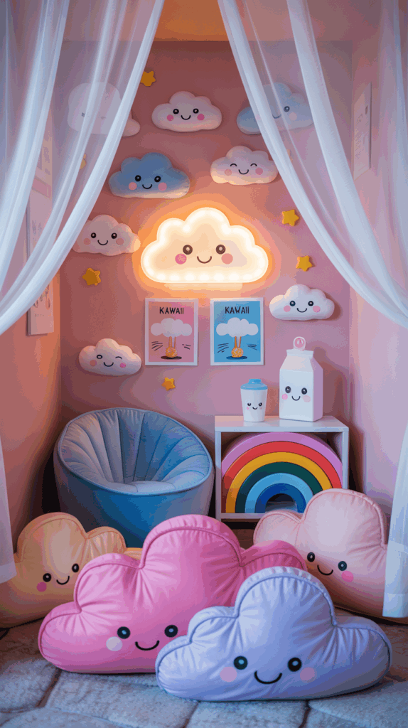 Turn a reading nook into a pastel sky paradise with soft cloud-shaped cushions, sheer white curtains, and a sky-blue bean bag chair. Hang DIY rainbow garlands from the ceiling and add fluffy rugs in pink and lavender. Stick pastel vinyl decals of smiling clouds and stars along the wall. Use a clip-on LED cloud lamp for cozy reading light. Add a tiny bookshelf shaped like a rainbow. Place a cup holder that looks like a milk carton on the shelf. Frame kawaii art prints of happy weather scenes on the wall. Use pastel washi tape to border mirrors or picture frames for extra pop. The vibe: like snuggling inside a candy-colored dream cloud.