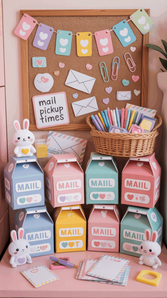 Create a tiny kawaii mail station with pastel cardboard “milk carton” mailboxes labeled “Love Notes,” “Dream Requests,” and “Secret Missions.” Decorate the wall above with floating envelope cutouts and a mini bulletin board for doodles, quotes, or “daily delivery” notes. Add a basket of gel pens, washi tape, and mini note cards for friends or plushies to write messages. Include a “Mail Pickup Times” sign that changes daily, just for fun. Add heart or star stamps (real or paper) and a “Kawaii Post” banner with sticker seals and pastel paperclips. Decorate with mini stuffed birds or bunnies as your designated postmasters. This is the perfect nook for journaling, pretend play, or snail-mailing some cheer.