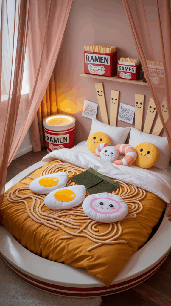 Design your bedding area to feel like the coziest bowl of kawaii ramen ever. Use a mustard yellow comforter with noodle-like squiggles and round plush pillows shaped like eggs, shrimp, and narutomaki. Hang wall art of happy ramen bowls and a neon sign that says “Slurp Zone.” Craft DIY paper chopsticks with smiley faces and attach them to the wall above the headboard. Place a ramen cup storage bin by your bed for snacks or cozy socks. Use chopstick-shaped curtain rods with sheer pink panels to tie in the theme. Add noodle-doodle sticky notes and decorate nearby shelves with faux mini ramen kits. Make a bedside lamp out of an actual clean ramen cup with an LED inside. Scent the room lightly with soy-scented candles or a ginger diffuser. It’s quirky, delicious-looking, and ultra-kawaii.