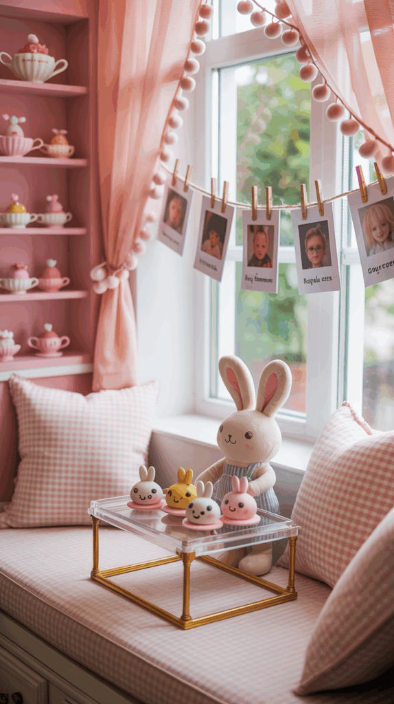 Transform your window seat into a cozy bunny café inspired by pastel cafés in Harajuku. Add gingham seat cushions, plush bunny baristas, and a mini chalkboard menu with doodles like “Fluffy Matcha” and “Strawberry Latte.” Use a clear tray table for faux pastries made from clay or felt, with kawaii faces of course! Hang tiny café curtains with lace trim and pom-pom garlands across the top of the window. Include a pastel teacup shelf with mini resin desserts and tiny spoons. Clip photos to a clothesline labeled “Regular Customers” featuring you and your plushies. Install a mini bell and sign that says “Open for Cuteness.” It’s perfect for reading, journaling, or tea parties with your plush squad.