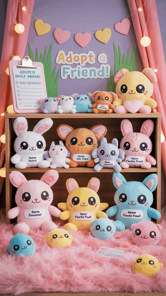 Transform a shelf into a pretend “Kawaii Pet Adoption Center” filled with plush animals—bunnies, kittens, axolotls, and more—all with big anime eyes and adoption tags. Create adoption certificates for each plushie with a name, birth date, and “favorite treat.” Use wooden crates labeled with cute fonts like “Nap Time Buddies” or “Looking for Love.” Add mini pet beds (tiny pillows), food bowls made from bottle caps, and tiny accessories like bows and glasses. Set up a clipboard where you log their daily adventures or moods. Include a mini mailbox for fan mail to your plushies. Let each pet have a personality card (e.g., “Boba the Panda: loves lo-fi music and marshmallows”). Decorate the wall behind with faux grass, heart garlands, and pastel pet shop signage. The ultimate cozy corner for plushie lovers!
