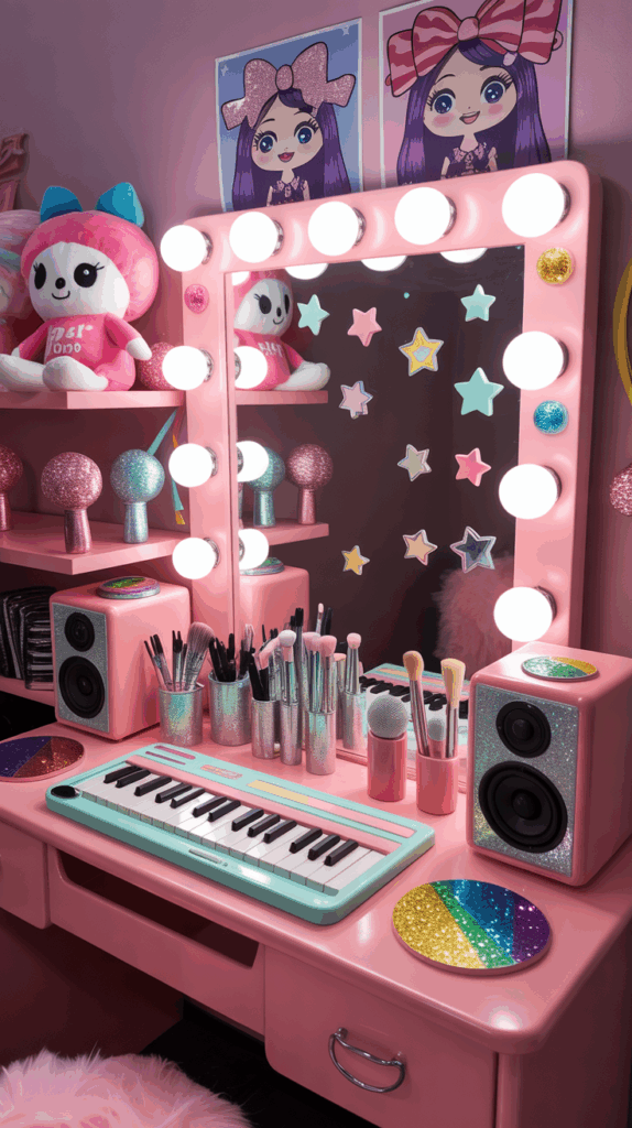 Turn your vanity into a kawaii J-pop stage with glittery decals, microphone-shaped makeup brushes, and a light-up mirror surrounded by star stickers and mini disco balls. Use a faux stage curtain backdrop in pink velvet or holographic fabric behind your mirror. Add a plushie “fan club” arranged on shelves with mini glow sticks and confetti pom-poms. Use a pastel keyboard mat and glitter speaker for impromptu concerts. Keep a hair accessory display labeled “Backstage Glam.” Hang posters (real or DIY) of imaginary pop idols with sparkling eyes and giant bows. Bonus: set up a phone tripod for recording kawaii glam sessions. Whether you’re doing your makeup or performing in front of plushies, it’s all about the spotlight sparkle.