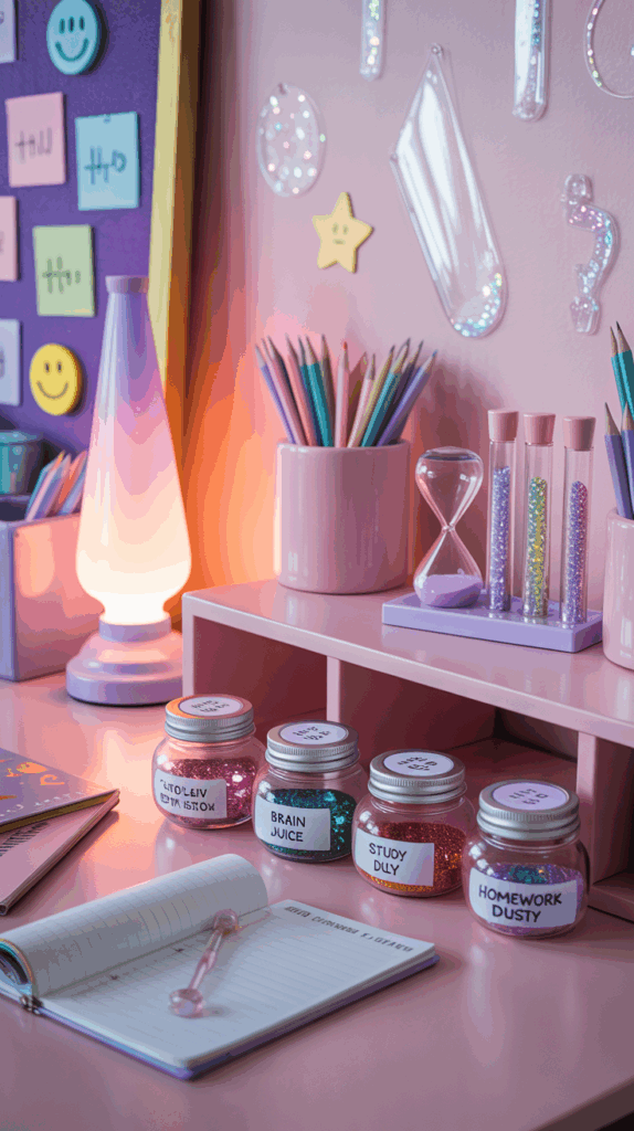 Turn homework into magic with a kawaii “potion lab” theme for your desk area. Use small round jars labeled with fun names like “Brain Juice,” “Creativity Spark,” and “Homework Dust” filled with glitter and beads. Hang a banner above that says “Study Spells Only.” Tape pastel formula symbols and smiley stars on your bulletin board. Set a lavender lava lamp in the corner for bubbly ambiance. Use iridescent pencil cups and a test tube-shaped highlighter set. Print your planner pages with potion graphics in the margins. Add a unicorn-shaped hourglass to time study sessions. Stick clear wall decals that look like floating sparkles above the desk. The result? An enchanting, pastel-powered productivity station.