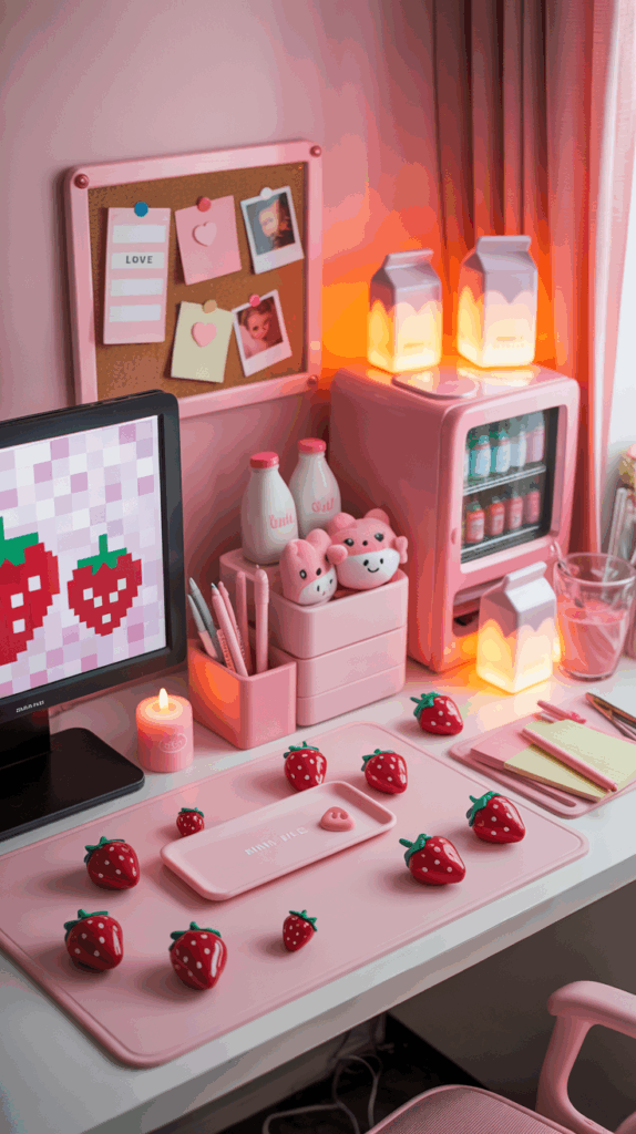 Build your entire desk space around the ultra-kawaii theme of strawberry milk. Start with a pink mini desk mat featuring strawberries and sparkles. Use a cube-shaped pink mini fridge nearby for aesthetic drinks and skincare. Decorate your shelves with strawberry plushies, milk bottle-shaped pen holders, and pastel pink organizers. Choose a monitor wallpaper with adorable pixel art strawberries. Add a strawberry-scented candle and soft LED lighting shaped like cartons of milk. Use strawberry-themed sticky notes and a soft-touch keyboard in pastel hues. Tape kawaii strawberry stickers around your drawers and lamp base. Hang a mini corkboard with love notes and mini Polaroids in red-pink tones. It’s sweet, quirky, and oh-so Instagrammable.