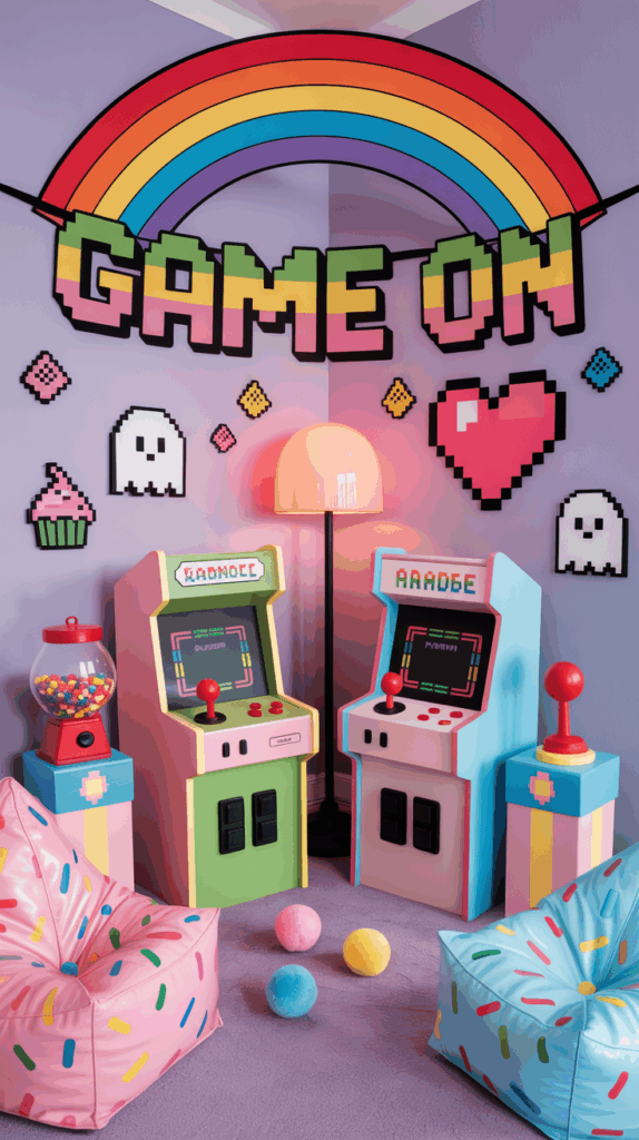 Create a kawaii mini arcade using cardboard boxes decorated as vintage game consoles, claw machines, or token dispensers—all painted in soft neons and covered in stickers. Add a faux joystick lamp, pixel heart wall decals, and sprinkle-patterned beanbags. Decorate with pastel pixel art: smiling ghosts, floating cupcakes, and rainbow gems. Add a scoreboard whiteboard with achievements like “Most Stickers Collected Today” or “Super Plushie Champion.” Use a pastel gumball machine filled with mini erasers or pom-poms as “prizes.” Hang a sign that says “Insert Joy to Begin.” This is where gaming nostalgia and kawaii vibes collide in the most colorful way.