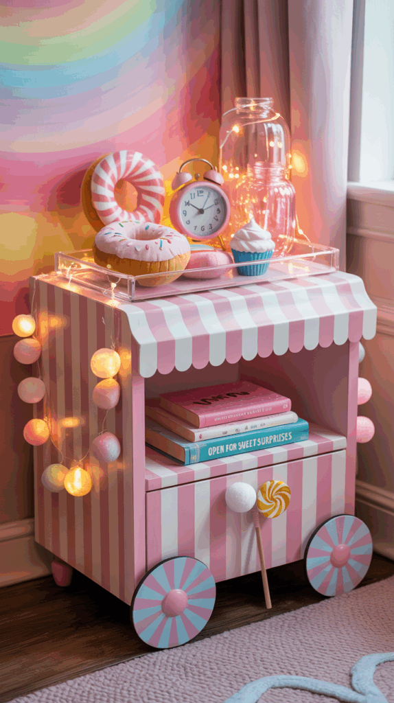 Transform a basic nightstand into a rolling candy cart by attaching a scalloped paper roof and painting candy stripe patterns on the sides. Add faux wheels made from painted plates and glue on mini cotton candy or lollipop décor pieces. Inside the drawers, use themed bins labeled “Sweet Dreams,” “Midnight Mints,” or “Treat Yo’ Self.” Hang pastel chains or garlands off the side for extra flair. Decorate with candy jar fairy lights or use a cupcake-shaped alarm clock on top. Add a hanging tag on the knob that says “Open for Sweet Surprises.” Top it with a clear tray holding plush donuts, a nightlight in the shape of an ice cream cone, and your favorite bedtime book. It’s practical and looks like it came straight from a sugar-coated daydream.