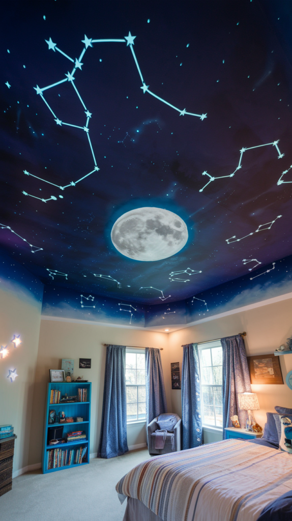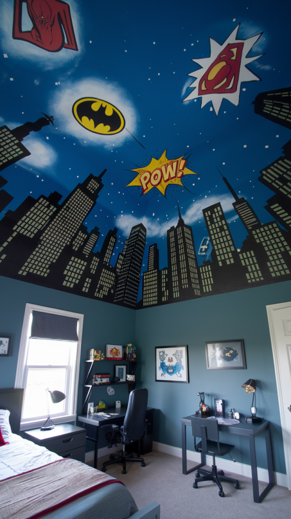 Paint the ceiling to mimic a nighttime city skyline, complete with superhero logos projected into the “sky.” Add comic-book-style text like “Pow!” or “Zap!” for a dynamic look. Use bright, contrasting colors to capture the energy. A fun option for superhero fans.