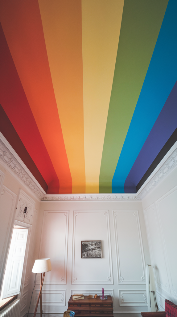 Paint bold, colorful stripes across the ceiling in a rainbow pattern. Use matte or glossy paint to match the room’s overall design. This cheerful design brightens the space and adds energy. Ideal for kids who love vibrant and playful colors.