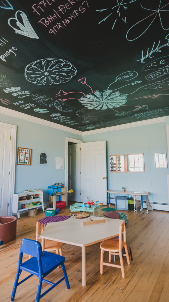 Paint the ceiling with chalkboard paint, allowing kids to draw or write their own creations overhead. Provide them with non-toxic chalk for endless fun. This design is interactive and can be updated as often as they want. Great for artistic and creative kids.