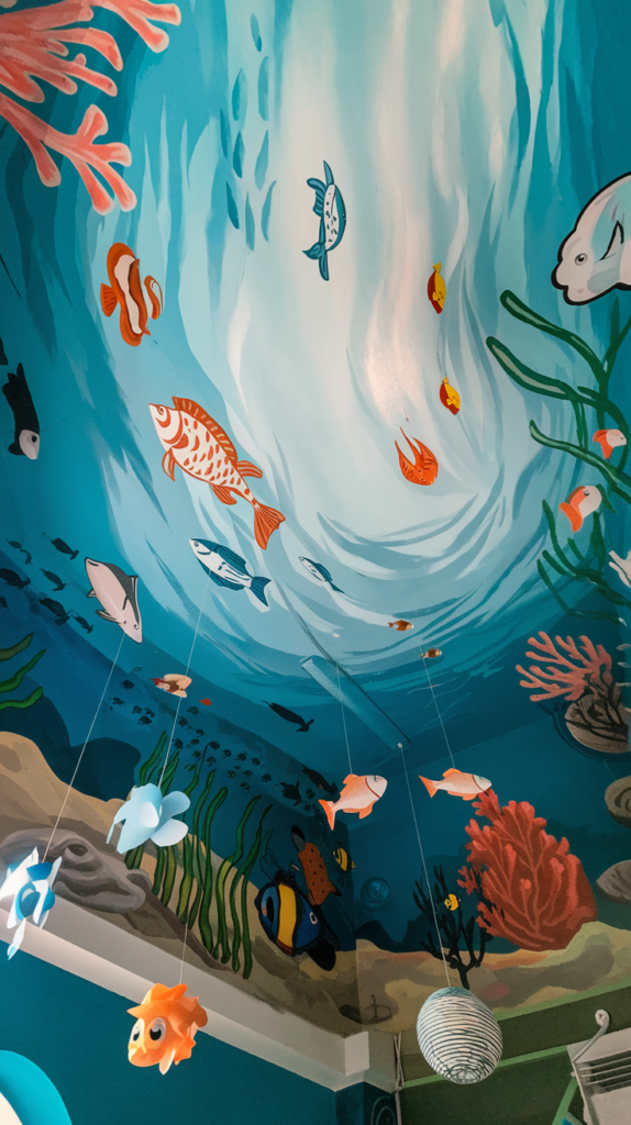 Create an underwater world with a painted ceiling featuring fish, coral, and waves. Use soft blues and greens to give the space a calming effect. Add hanging décor like fish-shaped mobiles for a 3D effect. Perfect for kids who love the ocean.