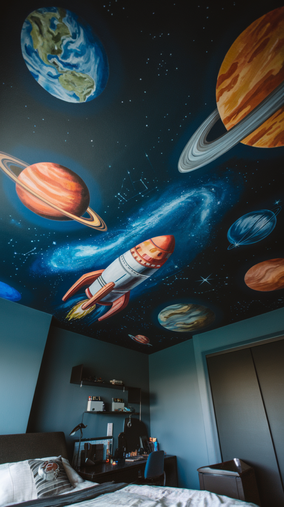 Go beyond glow-in-the-dark stars by painting planets, rockets, and galaxies across the ceiling. Use metallic and UV-reactive paints for a futuristic glow. Incorporate LED strip lights to simulate a spaceship vibe. A perfect fit for aspiring astronauts.