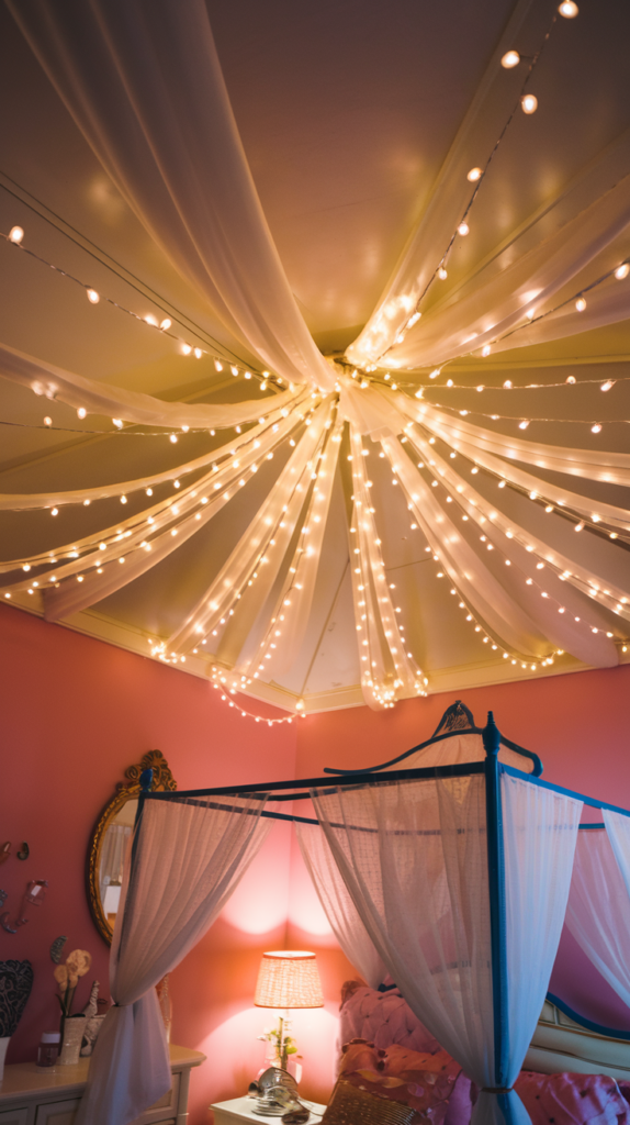 Drape fairy lights across the ceiling to create a magical, twinkling effect. Pair it with sheer fabric for an elegant canopy vibe. This design works especially well in princess or storybook-themed rooms. Adds warmth and charm to any space.