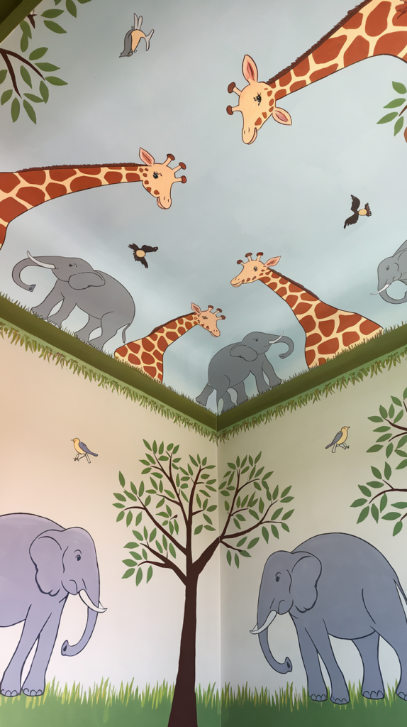 Paint animals like giraffes, elephants, or birds peeking down from the ceiling edges. Use soft colors for a playful, non-overwhelming look. Include a tree or grass border on the walls to complete the theme. Perfect for safari or zoo enthusiasts.