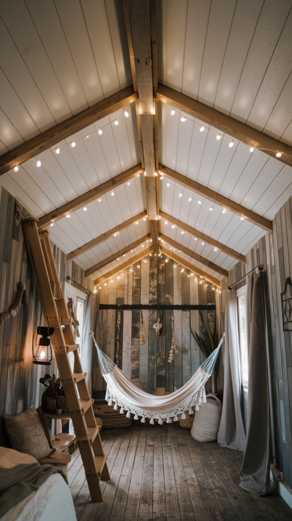 Install wood panels or faux beams for a rustic, cozy cabin vibe. Paint them white or leave them natural for a warm aesthetic. Pair with fairy lights or lantern-style fixtures for added charm. Perfect for adventure-themed bedrooms.