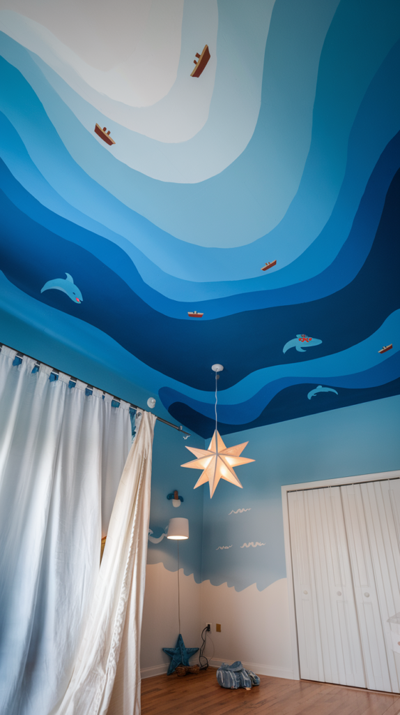 Paint the ceiling in gradient shades of blue to mimic ocean waves. Add small boats or dolphins for extra detail. Use a textured roller to create wave-like effects. A calming design for water-loving kids.