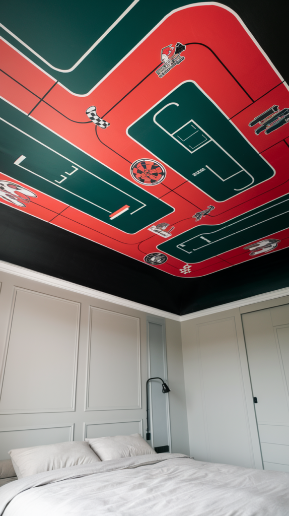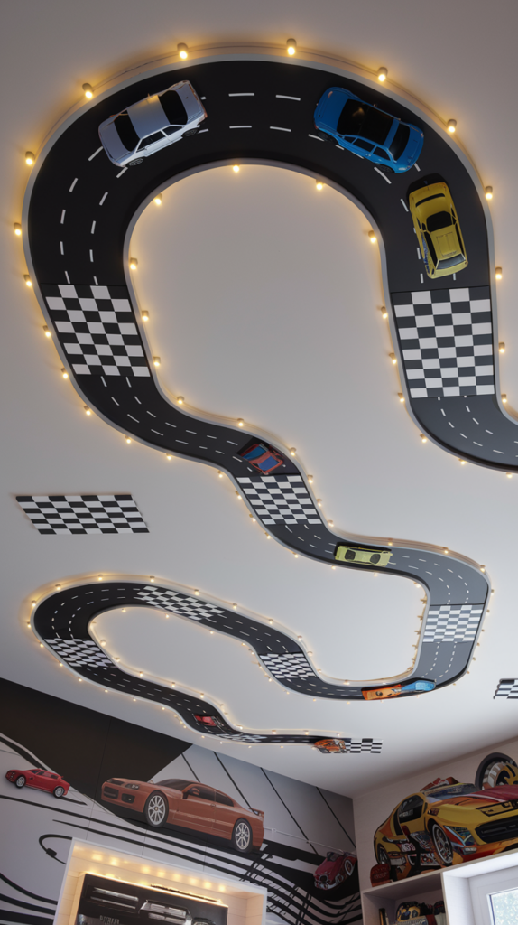 Paint a race track winding across the ceiling with toy car decals or 3D props. Use checkered patterns for added flair. Incorporate LED lights for a racing vibe. Perfect for car enthusiasts.
