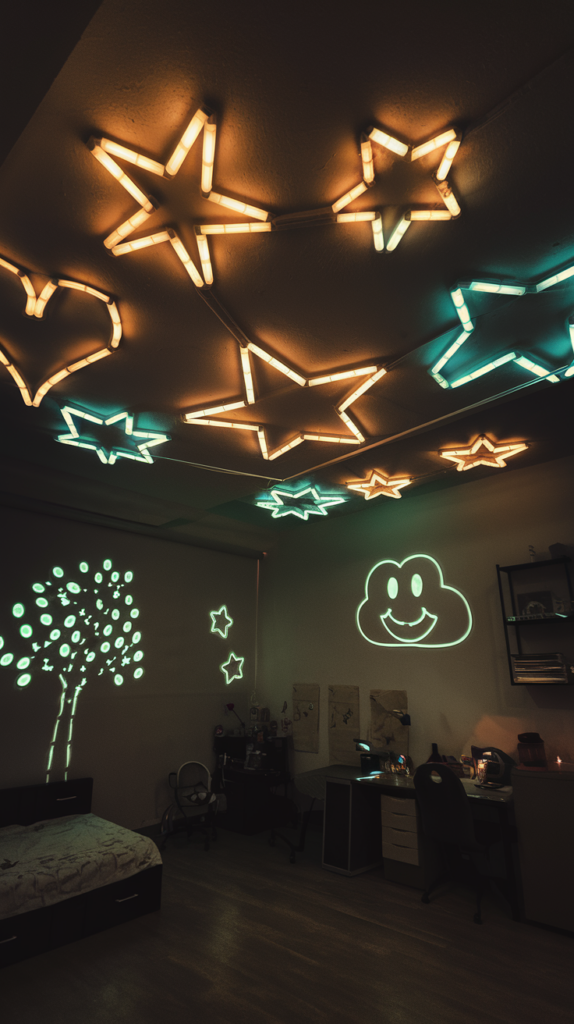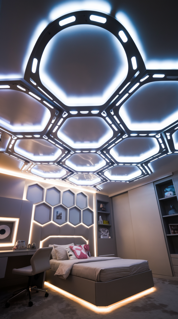 Install LED light panels in circular or hexagonal shapes to mimic a futuristic space station. Use soft, adjustable lighting to create a high-tech ambiance. Add glow-in-the-dark details for nighttime excitement. A sleek design for kids who love science fiction.