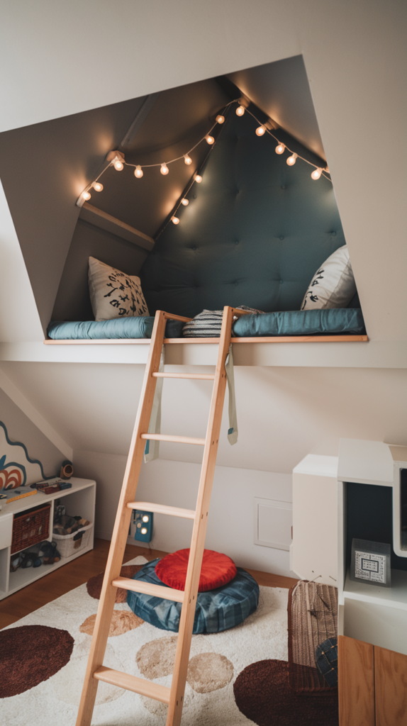 Build a small, hidden nook into the ceiling with a cozy platform and ladder. Decorate it with cushions and fairy lights for a secret reading spot. This doubles as a playful and functional space. A unique option for adventurous kids.