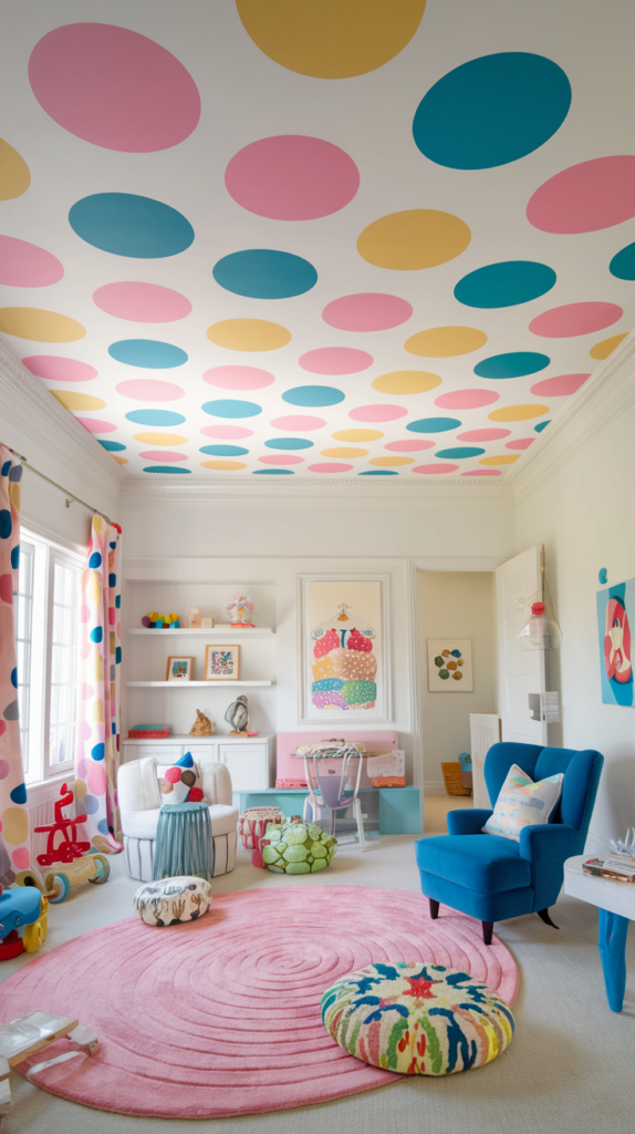 Add colorful polka dots in varying sizes to the ceiling for a playful and cheerful design. Use removable decals or stencils for an easy application. Mix and match colors to complement the room’s theme. A lighthearted and versatile design.