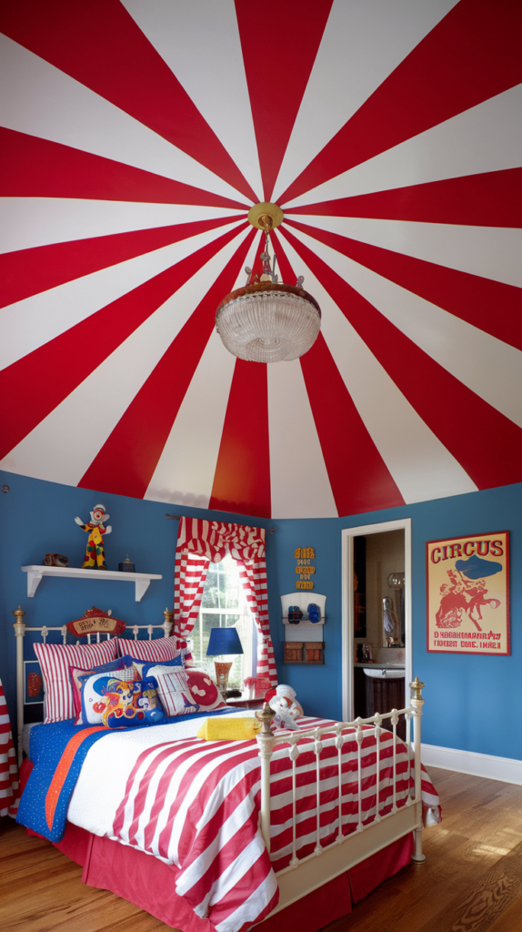 Paint red and white stripes radiating from the center to mimic a circus tent. Add a chandelier or pendant light in the middle for a theatrical touch. Pair with circus-themed bedding and décor. A vibrant and fun design.