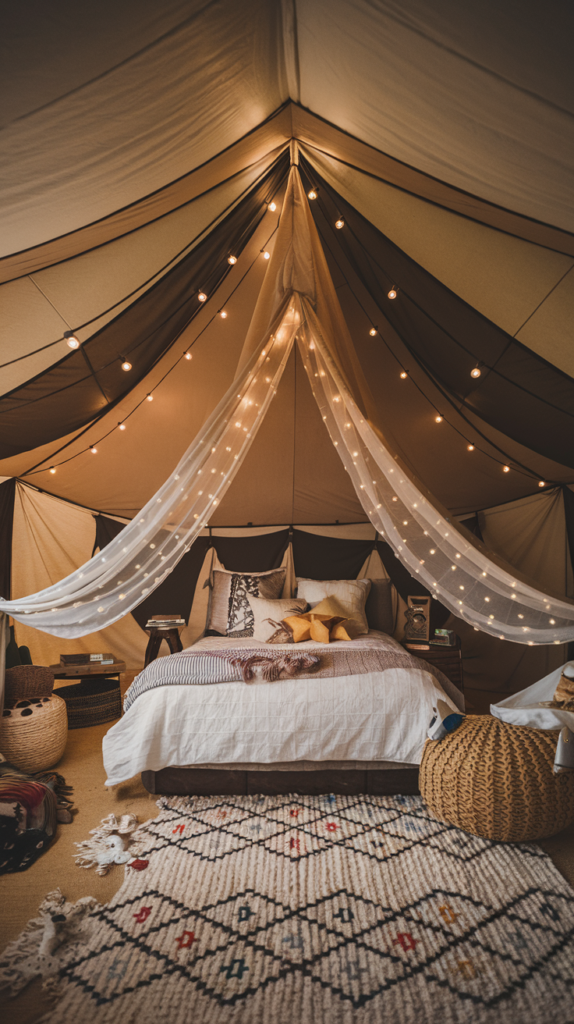 Use fabric to create a tent-like draped ceiling for a cozy, camping vibe. Choose light, breathable fabrics in neutral or colorful tones. Add string lights for a magical touch. A great option for adventurous kids.
